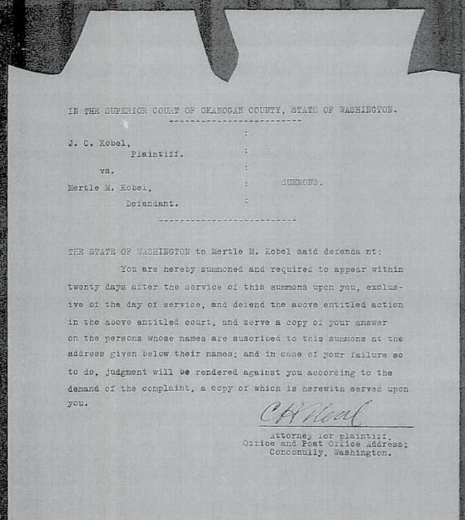 J.C.Kobel, Plaintiff. vs. Mertle M.Kobel, Defendant (Summons)