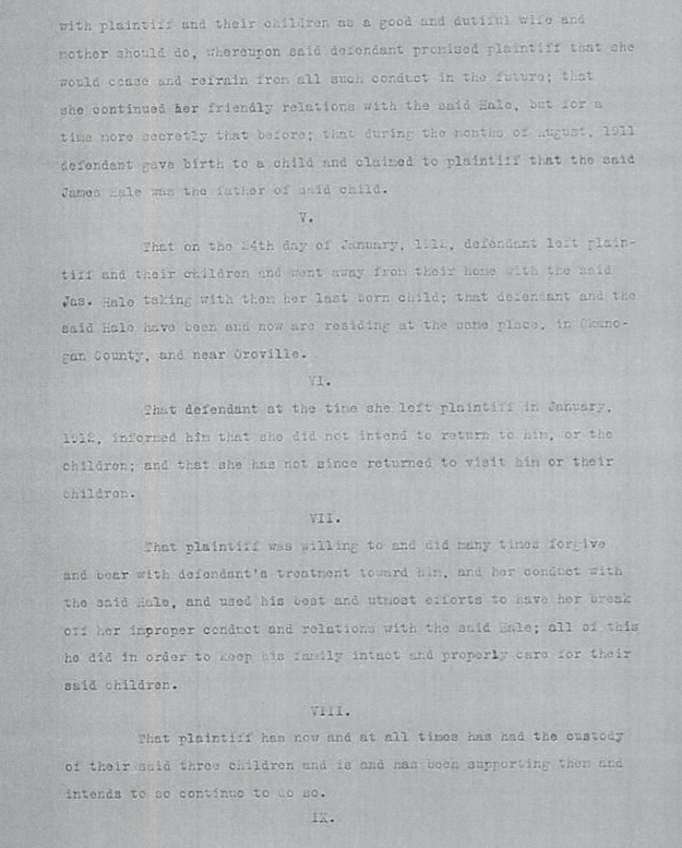 V. That on the 24th day of January 1912, the defendant left plaintiff and their children and went away from their home with the said Jas. Hale taking with them her last-born child’ that defendant and the said Hale have been and now are residing at the same place, in Okanogan County, and near Oroville.