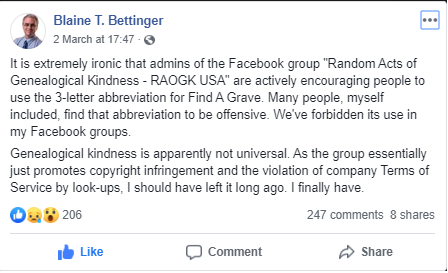 The problem is, there are some that are refusing to acknowledge this issue. Earlier this week, noted genetic genealogist Blaine Bettinger asked the Facebook genealogy group RAOGK (Random Acts of Genealogical Kindness) to stop using the term as shorthand. This one post has garnered over 247 comments and 8 shares.